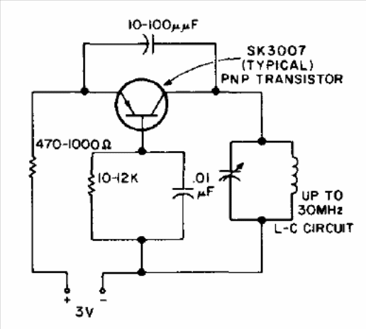 We found this simple oscillator in a 1977 amateur radio documentation. It can oscillate up to 30 MHz with a common PNP transistor like the BC558. With an RF PNP we can go beyond 100 MHz, reducing the capacitor between the collector and the emitter to values between 1 pF and 4.7 pF typically.