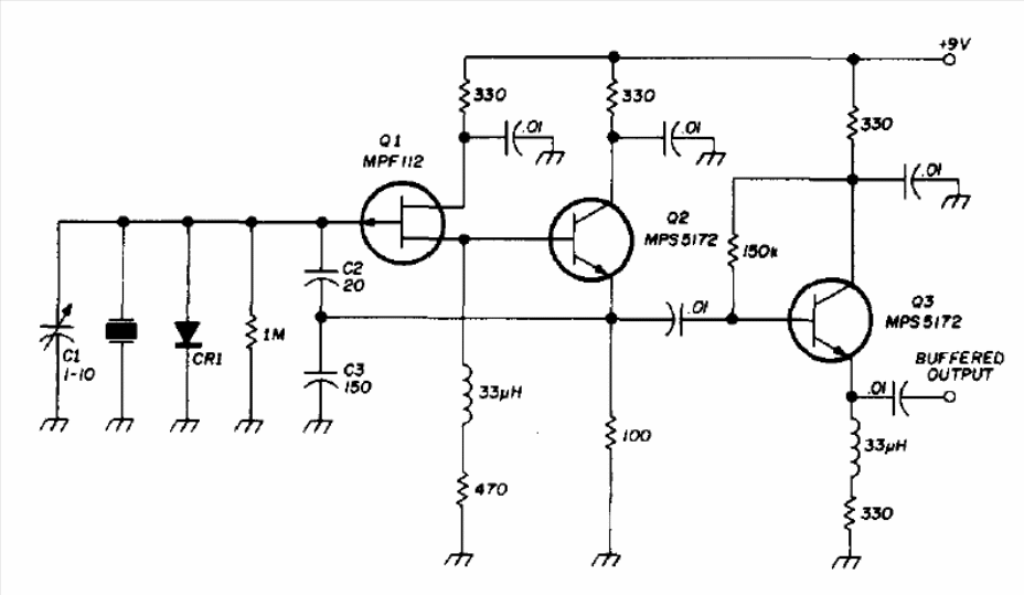 This circuit was found in a documentation for radio amateurs in 1974. It can be used to generate signals in the indicated range, depending on the crystal. The FET can be the BF245 and the other 2N2222 transistors. The power, in fact, can be made with voltages of 9 to 12 V and the consumption is low.