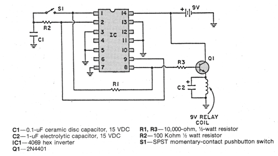 This bistable control uses a 4069 as bistable. The circuit can drive relays up to 100 mA with the BC548 transistor. Better activation is achieved with the relay on the collector and an opposing diode instead of C2. The circuit is from an American publication from the 1980s. A 12 V supply can be used with the relay being replaced by one with this voltage.