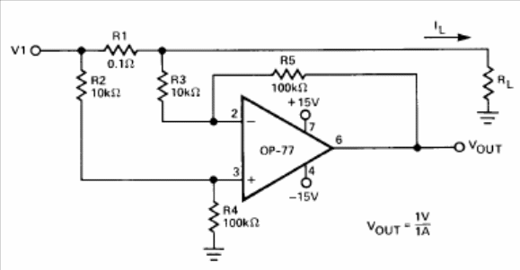 We show in the figure how to implement a current monitor circuit using only an operational amplifier. We obtained this configuration in the manual of integrated circuits from Analog Devices. This circuit operates with sources up to 15 + 15 V making it ideal for applications such as full-wave bridge circuits. Note that the circuit output is 1 V per amp, value given by resistor R1. The accuracy of this resistor will therefore determine the accuracy of the circuit output. Another characteristic of this circuit that deserves to be highlighted is its great rejection in common mode that reaches 120 dB, due to the integrated used circuit.