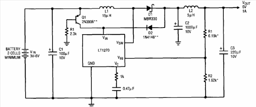This circuit is from LinearTechnology Applications of 1997. The circuit uses components of the time used to raise the voltage of a battery from 3 to 6 V.