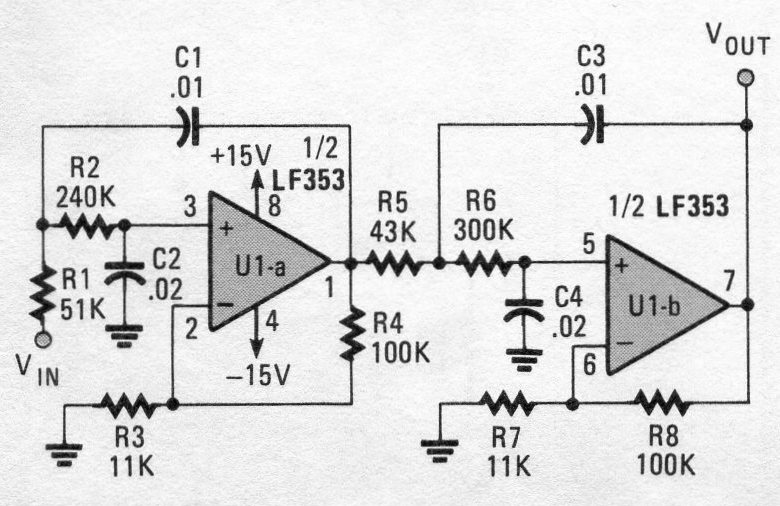 This filter, with a cut-off frequency of approximately 1 kHz, has a high Q and employs two operational ones. The power supply must be symmetrical.