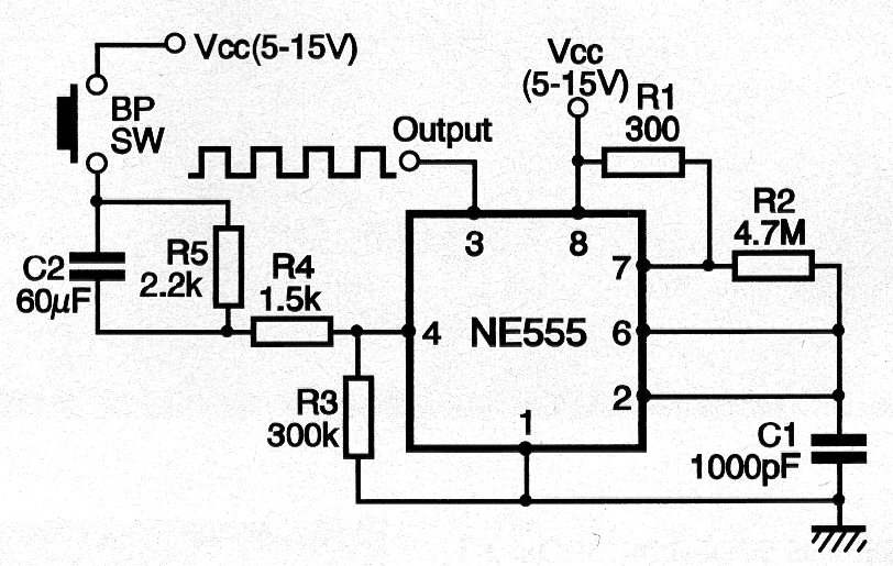 This circuit generates pulses whose frequency depends on C1. The circuit can be powered by voltages from 5 to 15 V. We find this configuration in a Signetics manual.