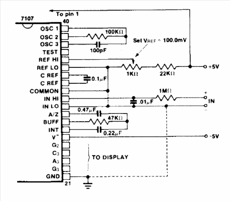 This circuit, from Intersil Databook since 1983, shows the use of the ICL7107 in a voltmeter with an internal reference of 100 mV. The circuit is powered by voltages of 5 and 9 V. This circuit is found in many inexpensive multimeters.