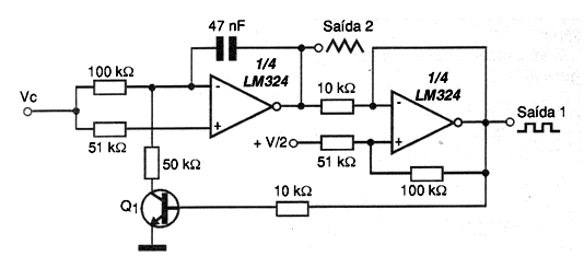 The circuit shown in the figure uses two of the four operational amplifiers found on the LM324 integrated circuit. Most common operational amplifiers can be used in the same configuration, depending on their characteristics only the limit of the generated frequency range. The central frequency of the circuit is given by the capacitor and the transistor used can be any general purpose one like the BC548. The control voltage can vary between 0 and 50 V typically since we have high values of resistors at the input and a limiting circuit. The circuit has two outputs in which triangular and rectangular signals are obtained. The power supply does not need to be symmetrical, but the need for a V / 2 bias voltage (half the supply voltage) at the positive input of the operating second must be observed. This voltage can be obtained with a divider formed by two 10k ohms resistors connected in series.