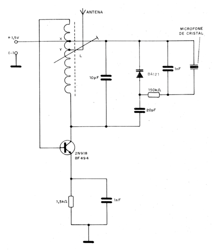 This circuit can be powered by a single battery, either ordinary or button type. The coil consists of 4 + 2 turns of wire 28 or 30 in an adjustable ferrite core. The antenna is 15 to 30 cm long and the range is a few tens of meters.
