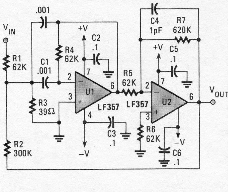 We found this circuit in a documentation from the 90s. It lets frequencies around 1 kHz pass, depending on the accuracy of the components. Operational Amplifiers equivalents can be employed, and the power supply must be symmetrical.