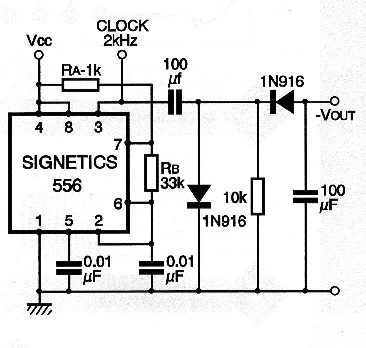This circuit doubles the input voltage, converting, for example, 6 V and 12 V. The output current is very low, and the frequency depends on the 0.01 uF capacitor. The circuit uses a double 555 which is 556. We found this circuit in Signetics documentation.