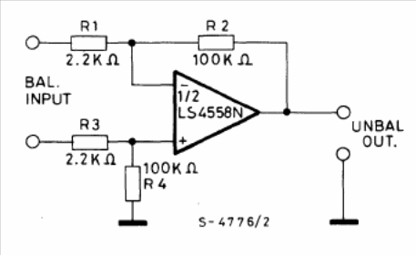 The operational amplifier used is a double 741. The power supply is symmetrical, and the gain is given by the relationship between R1 and R2. The circuit is from the 1982 SGS Linear Integrated Circuits Manual.