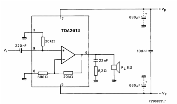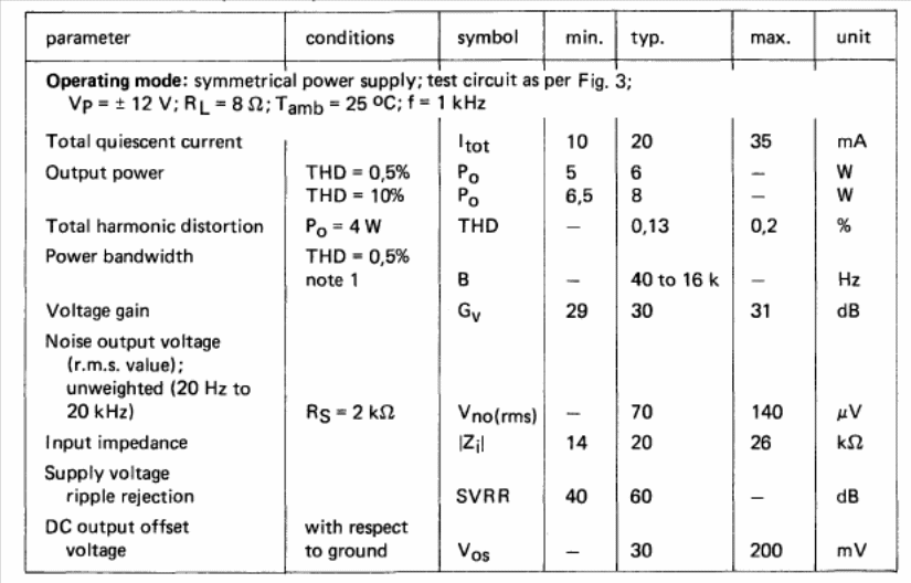 This circuit is from a 1990 Philips Databook. The circuit uses a symmetrical source and power from 15 to 40 V. Performance information is given in the table below.
