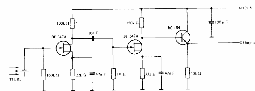 We found this circuit in the Texas Instruments optoelectronics manual. Field effect transistors can be BF245 and bipolar BC548. The sensor is a photodiode in the photo-generator mode.