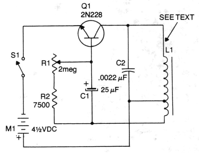 Interval pulses emitted by this circuit are picked up in a medium wave radio nearby. The circuit is from a 1981 publication but can be assembled with a BC548. The coil consists of 30 + 70 turns of wire 28 in a ferrite rod. An antenna can be connected to the transistor collector for greater range. The supply can be made with voltages of 4.5 to 6 V.