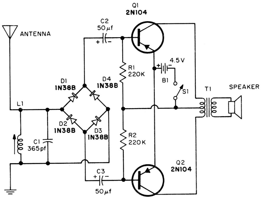 This different configuration of AM radio with push pull detection and amplification provides good performance for local stations. The circuit is from 1964 documentation and the transistors can be BC558. The diodes can be 1N34 or equivalent and the transformer is the type of output found on transistor radios. The supply can also be done with 6 V and L1 is formed by 80 to 100 turns of enameled wire 28 in a ferrite rod.