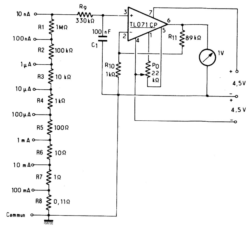 This circuit is designed to measure very weak currents, in the nanoampères range, using the 1 V scale of a common multimeter. The circuit needs a symmetrical source. Accuracy depends on the input resistors. The circuit is from a French documentation from 1982.