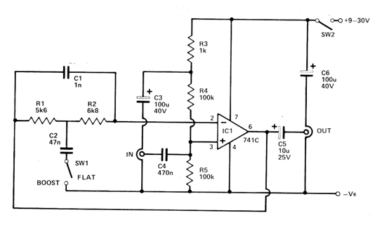 This circuit reinforces the treble, working as a booster for instruments or home theater. The circuit must be powered by a source with excellent filtration. It was found in a 1979 documentation.