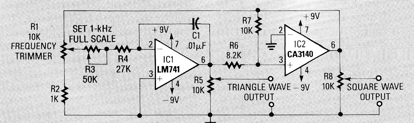 Two operational amplifiers 741 are used in this circuit that must be powered by a symmetrical source. Other frequency ranges can be obtained by changing C1. The circuit is from American documentation from 1993 and other operational ones can be tested.