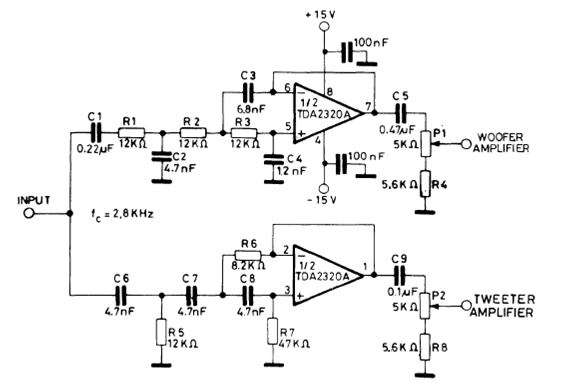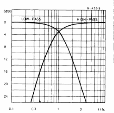 The integrated circuit used is not very common today, as the filter is from the manual of linear integrated circuits of SGS 1982. However, the performance is optimal as given by the graph. The supply must be symmetrical, and the input and output cables must be shielded. The cutoff frequency is 2.8 kHz