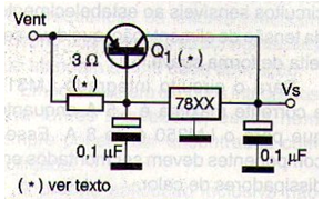 The block shown in the figure, although it is known to many readers, is not always in everyone's memory completely. It is possible to obtain a current greater than 1 A from any 78XX series regulator, depending only on the transistor used. For a TIP42, for example, we can easily reach 3 A, as long as it is mounted on a good heat radiator. The 3-ohm resistor determines the current in the regulator, which should be around 0.2 A. Eventually, this value must be decreased to obtain a greater excitation of a lower gain transistor and higher output current. The voltage regulator circuit must also be mounted on a heat radiator. Integrated circuits of the series, between 7805 and 7824 can be used, always remembering that the input voltage must be at least 2 V higher than the desired voltage at the output.