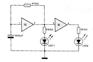 This circuit allows the use of two triggers (inverters or NAND gates connected in this way) to activate two LEDs that flash alternately. In this way, with the need to have an indicator on a TTL circuit, a dynamic effect can be easily achieved. For the diagram, the integrated is 7414 and the power must be supplied with 5 V. The positive is pin 14 of the integrated and the negative is pin 7. The capacitor can have values in the range of 10 uF to 1 000 uF according to the frequency desired for blinking.