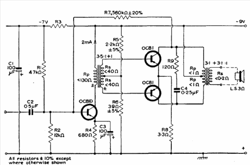 This class B circuit was found in the 1960 Mullard transistor reference manual. Transformers are the critical components. The source is not symmetric.