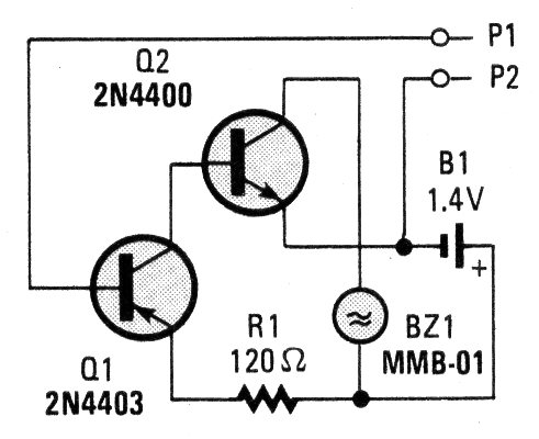 The indicator for this circuit is a mini buzzer with a 1.5 V oscillator. The circuit can also be powered with 3 V for buzzers of this type. The transistors can be the BC548. We found this circuit in an old Poptronics from the 90s.