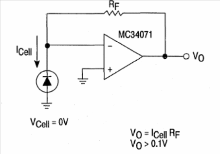 Other operational amplifiers in the series, such as the MC34072, MC34074, MC35071, MC35072, MC35074 d MC33071 can be used in this configuration found in Motorola's 1993 Linear Interface ICs. The circuit amplifies signals from a photocell or photodiode.