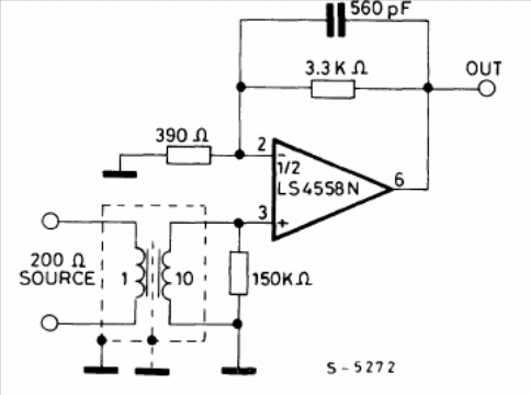 The integrated circuit used is a double 741 from SGS. The transformer is the critical component of the project, being indicated for low impedance microphones. The power supply must be symmetrical from 12 to 15 V.