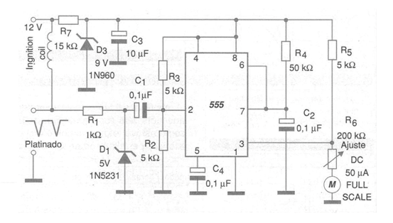 A traditional application of the monostable 555, used in engines that still employ the platinum system, or even for sensing moving parts or mechanisms with a system of reed switches or mechanical sensors is shown in the figure. In this circuit, the input pulses generate pulses of constant duration at the output of the monostable 555 that are integrated, serving to activate a current indicator. The current in this indicator will then be proportional to the frequency of the pulses applied to the input.