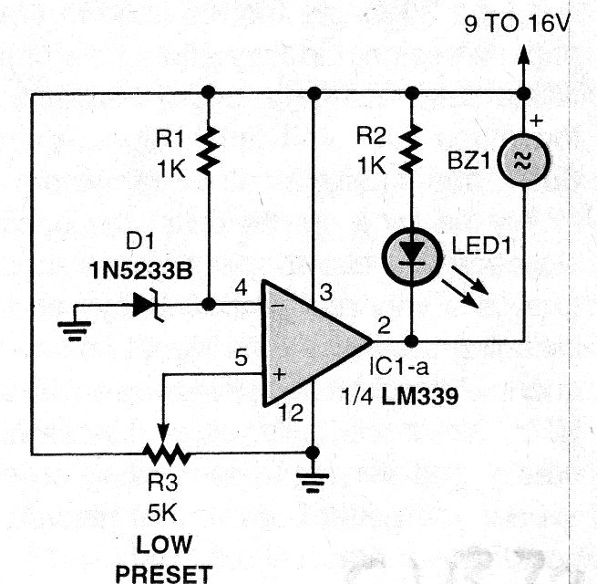 When the voltage supplying the circuit falls below the zener value, the LED lights up, and if a low current buzzer is used, it is activated. The circuit is from a 1999 American publication.