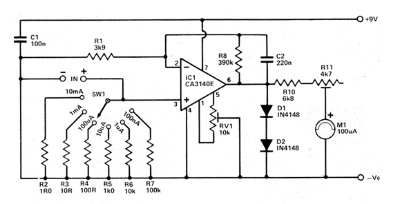 The accuracy of this circuit depends on the resistors connected to the band selection network. The instrument may be an ordinary multimeter at its lowest current range. The battery is powered, and the consumption is low. We found this circuit in a 1979 documentation.