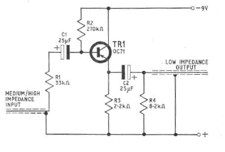 This circuit matches a source of high or medium impedance audio signals with a low impedance output. Equivalent transistors can be used. The circuit was found in a 1965 documentation.