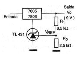 In the figure we show a way to change the output voltage of a fixed regulator, such as 7805 or 7806, to obtain a higher voltage with reference to a TL431. The reference voltage VREF will be added to the voltage of the regulator, this voltage being given by the relationship between R1 and R2 according to the following formula: