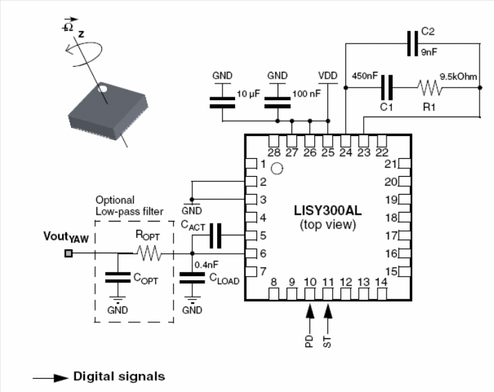 The circuit in the figure is suggested by ST Microelectronics (www.st.com) and consists of a gyroscope with an inertial MEMS LISY300AL sensor. The sensor operates on a single axis with analog output and can be supplied with voltages between 2.7 V and 3.6 V. The LISY300AL sensor includes the sensor element and an interface capable of providing an angular measurement in relation to the outside world, through analog output voltages. The LISY300AL has a full scale of +/- 300º / s and is capable of measuring rates with 3 dB up to 88 Hz. The component used can be obtained in an LGA 28-pin housing and has several applications such as virtual reality and games, motion control, video and camera image stabilization, GPS navigation and robotics.