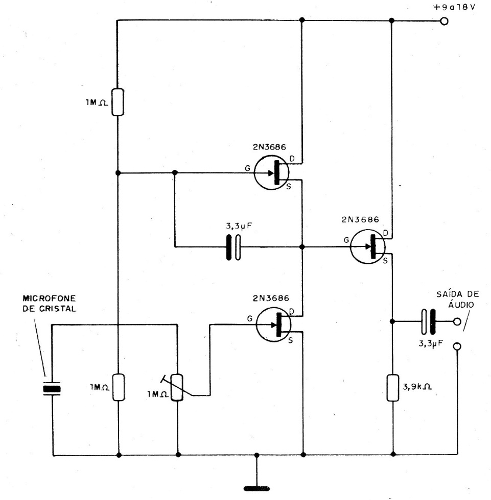 This circuit uses 3 FETs to convert the high impedance signal from a crystal or ceramic microphone to a low impedance signal. The circuit is from 1993 documentation and equivalent FETs like the BF245 can be used.