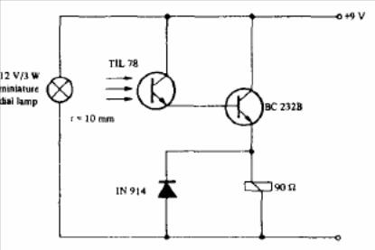 The recommended distance between the emitter and the phototransistor is 10 mm for this configuration. The circuit is suggested by the Texas Instruments opto-electronics manual. The relay must be according to the circuit supply.