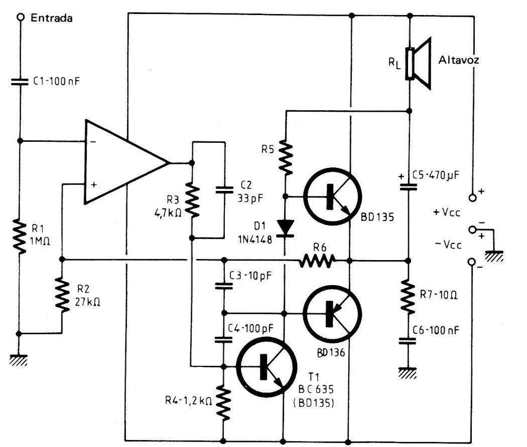 The audio amplifier presented can use speakers from 8 to 16 ohms, with a power supply from 4.5 to 15 V. The circuit is from a French documentation from 1982 and the power supply must be symmetrical. The table provides the values of the resistors according to power supply and output power.