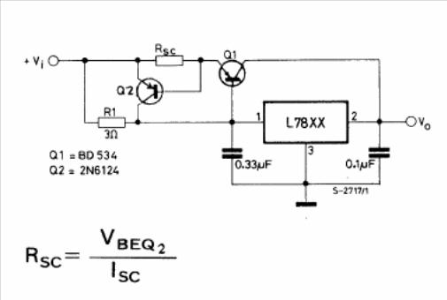The circuit shown is from the SGS manual of linear integrated circuits of 1982. The L78xx is equivalent to the common 78xx and the transistors can be replaced by equivalents depending on the output current. The formula allows calculating Rsc for the maximum current at which the circuit must act for protection.