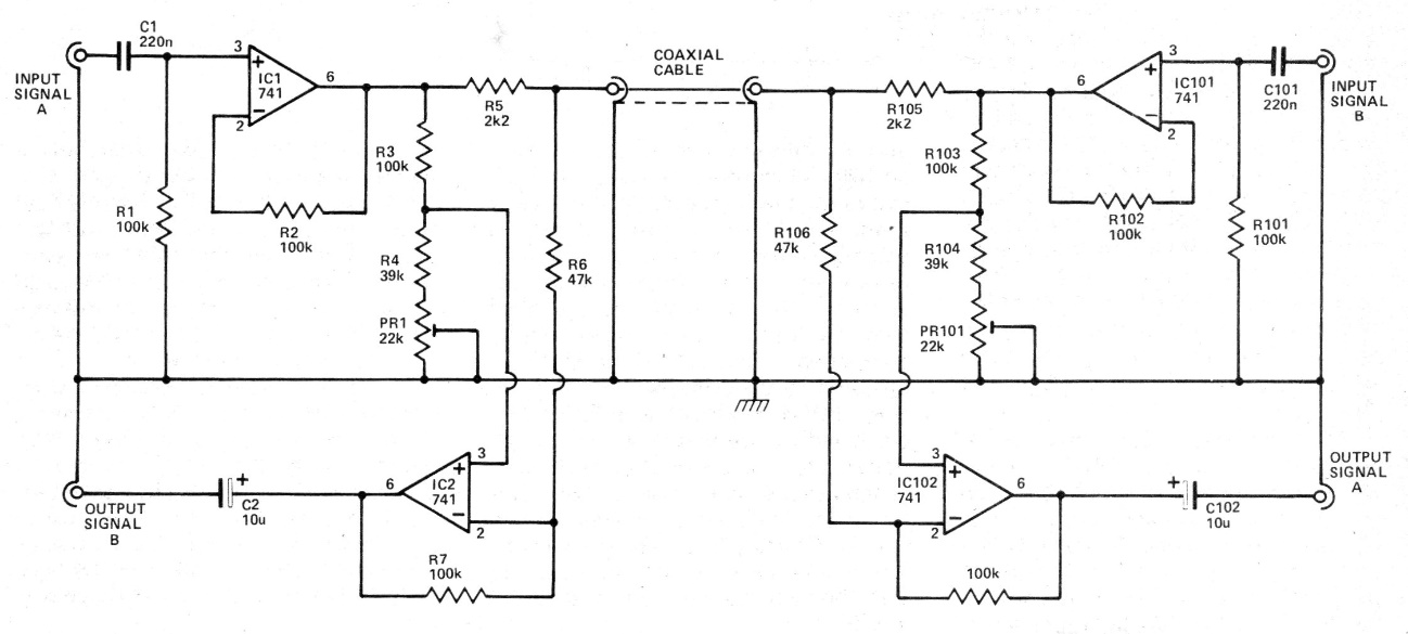 We found this circuit in an English documentation from 1981. It can be used as a base for a motorcycle intercom. The circuit uses operational 741 but can be implemented with equivalents. The source must be symmetrical from 6 to 12 V.
