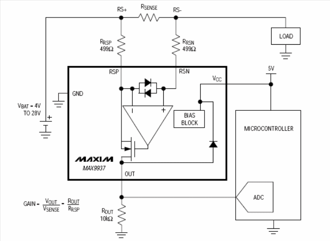 The circuit shown in the figure is suggested by Maxim (www.maxim-ic.com) and makes use of the MAX9937. The MAX9937 integrated circuit consists of a current sensor designed for operation in unidirectional mode on the high side of the circuit (high-side). Its purpose is to sense the current in a load up to 40 V, and also has protection against battery polarity inversion and EMI filter. The circuit has a common mode input range of +4 to +28 V and a supply current of only 20 uA. The pass band is 350 kHz with 3 dB. The basic component used, MAX9937 is supplied in a 5-pin SC70 enclosure. Among the suggested applications we mention the current sensing of batteries, fuse box and ECU current monitor.