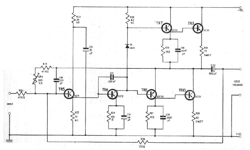 This amplifier is powered by a 9 V source. We found the circuit in a 1964 documentation. The transistors are made of germanium and modern transistors can be used with modifications to the bias components.