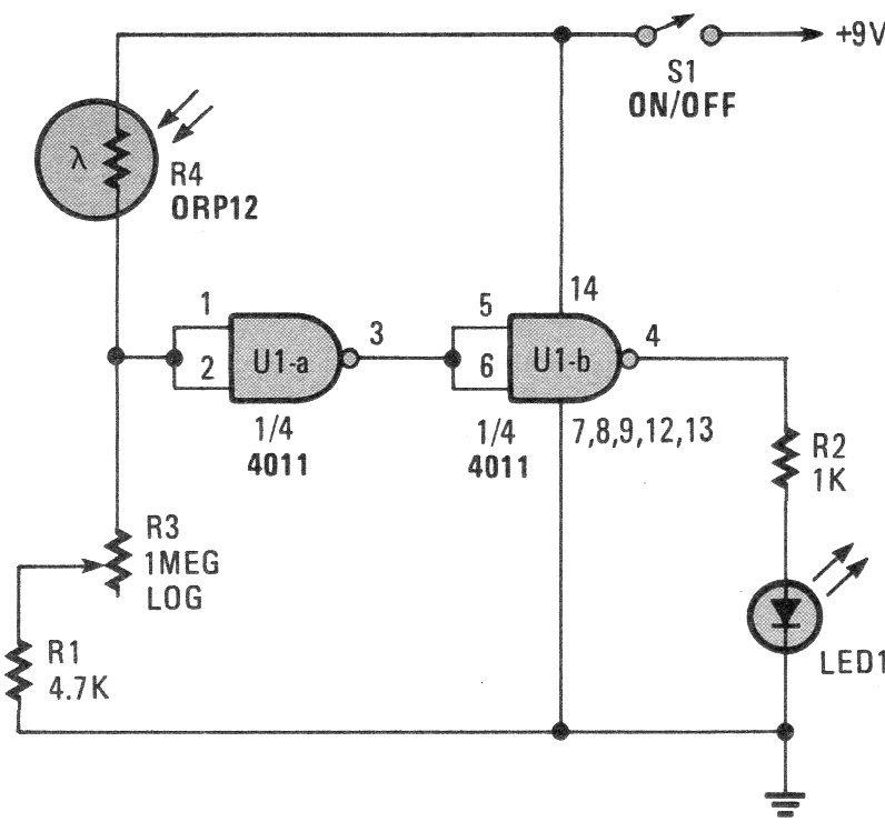 This circuit is used to control exposure times for light baths on printed circuit boards, for example. The circuit can be powered by voltages from 6 to 9 V. The adjustment in the potentiometer determines the exposure time according to the light intensity.