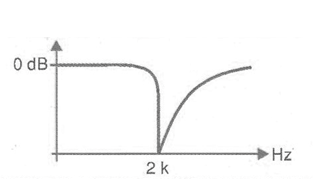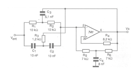 An interesting bandwidth filter configuration suggested by Texas Instruments in its Linear and Interface Circuits Applications - Volume 1 is shown in the figure. It is a circuit that uses a passive filter at the input (double T) followed by an active filter with an operational amplifier 741. The circuit is tuned to a frequency of 2 kHz and its response curve is shown in the same figure. This frequency is basically given by the double and the simple T in the negative feedback circuit of the operational. The circuit gain is 0 dB for frequencies that are not around 1 kHz. At a frequency of 2 kHz the attenuation reaches - 30 dB. The resulting Q factor is around 23. Of course, the components can have their values changed so that the filter operates centrally at other frequencies. We also remember that the power supply must be symmetrical.
