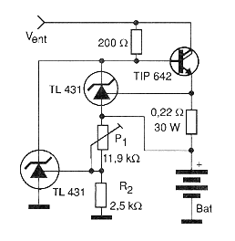 In the figure we have a battery charging circuit for currents up to about 5 A. In series with the battery, an ammeter and a voltmeter can be connected in parallel so that the charging process is monitored. The 0.22-ohm resistor is highly dissipating and the trimpot P1 adjusts the charging voltage, that is, the voltage at which the battery is considered charged. Two Texas Instruments TL431 voltage references that suggest this circuit are used. The Darlington transistor supports equivalents and must be mounted on an excellent heat radiator.