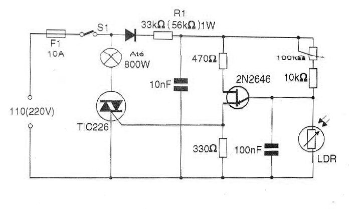The basic idea of the circuit shown in the figure is to increase the brightness of an ordinary incandescent lamp when the amount of ambient light that strikes the sensor decreases. Placed in a room, it will cause the lights to increase in brightness as it gets dark, this being the case with the opposite effect at dawn. Of course, the same configuration can be modified to operate with other types of sensors. Thus, if instead of the LDR we use an NTC, and as a heater load, the circuit will heat an environment when its temperature decreases, functioning as a thermostat. Of course, depending on the desired control range and the sensor's own characteristics, changes in component values may be necessary. The TRIAC used with suffix B operates on the 110 V network and with suffix D on the 220 V network allowing control of load currents up to 8 amps.