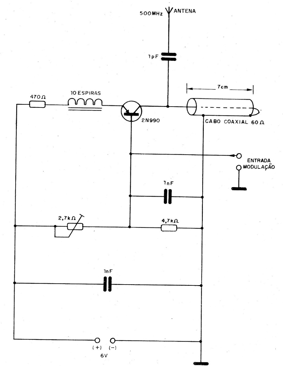This circuit can be used as a base for a UHF transmitter or even a test equipment. The circuit is critical, and the capacitors must be ceramic. The oscillating coil is nothing more than a length of coaxial cable that results in the desired frequency.