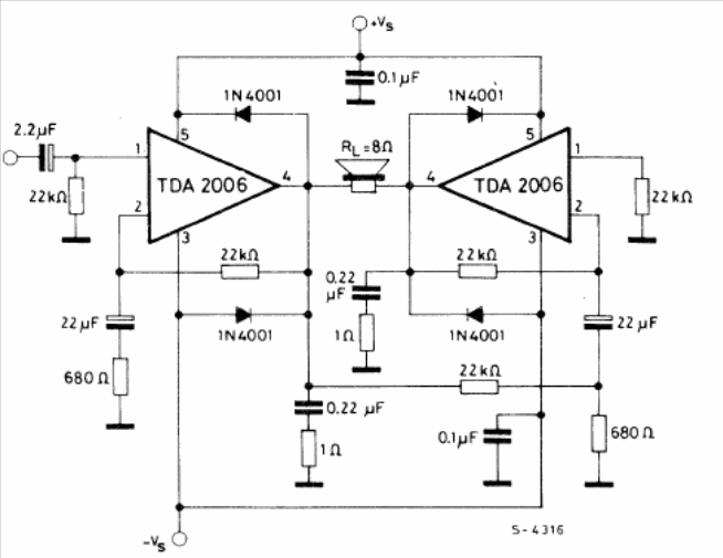 The power supply for this circuit must be symmetrical at 12 + 12 V and the load must be 8 ohms. The circuit is from the 1982 SGS Linear Integrated Circuits Manual.