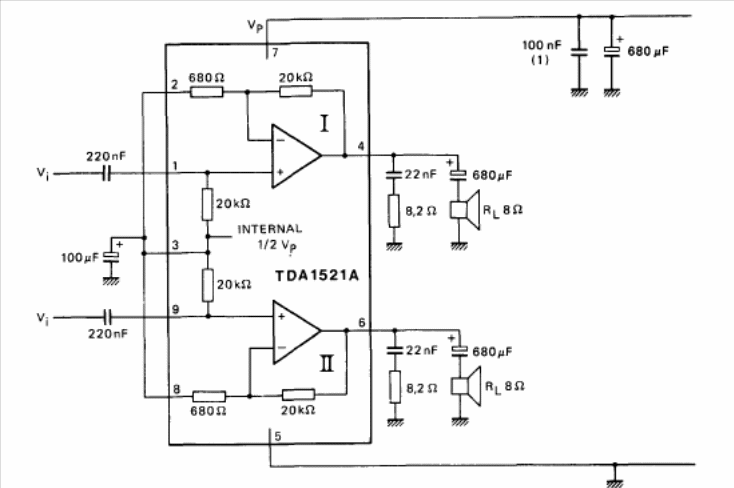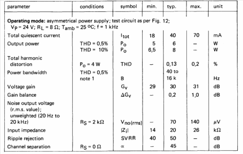 This amplifier for sound equipment was found in the Philips Databook of 1990. The circuit can be powered by a simple source of 15 to 40 V. The integrated circuit must have a good heat radiator.