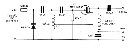 Using a 100 uH inductor for L1, this circuit will oscillate around 1 MHz. The frequency will be controlled by the control voltage, which can vary between 0 and 20 Volts. The field effect transistor can be either the MPF102 or the BF245, and the assembler must pay attention to the arrangement of the terminals of these components. The 2.5 mH coil serves as a load for the generated signal.