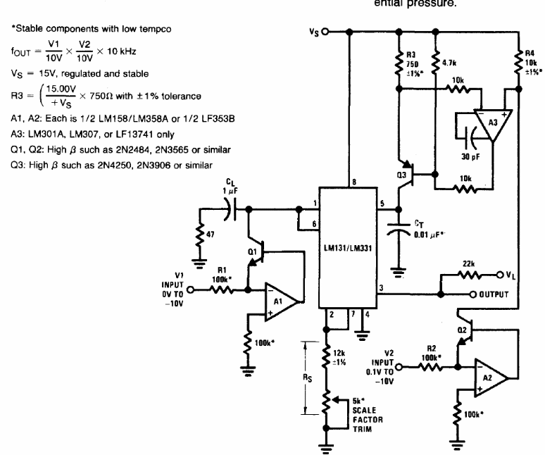 The presented circuit converts the product between two voltages in a frequency on a stable scale, according to the formula given next to the diagram. The circuit is from 1994 National Semiconductor documentation.