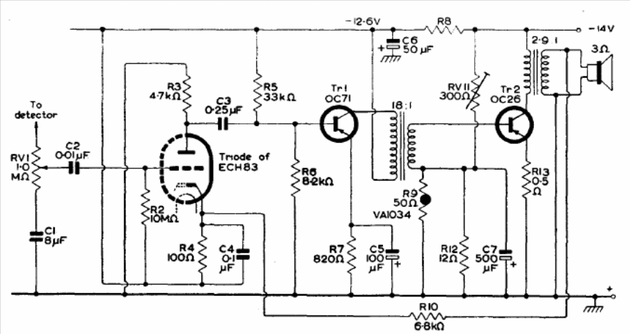 This audio configuration of televisions from the 1960s was found in a Mullard transistor reference manual. Transformers are the critical components.